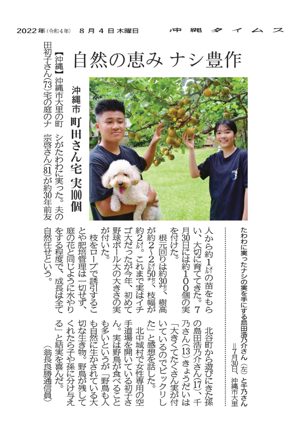 Hatsuko, who runs a women’s karate dojo in Kitanakagusuku Village, says that wild birds often eat the pears, but obviously pleased with the splendid crop of fruit, added that, “Both wild birds and we humans are important creatures that are kept alive by nature. If the wild birds leave some of them for us, we will share them with our children and grandchildren.”