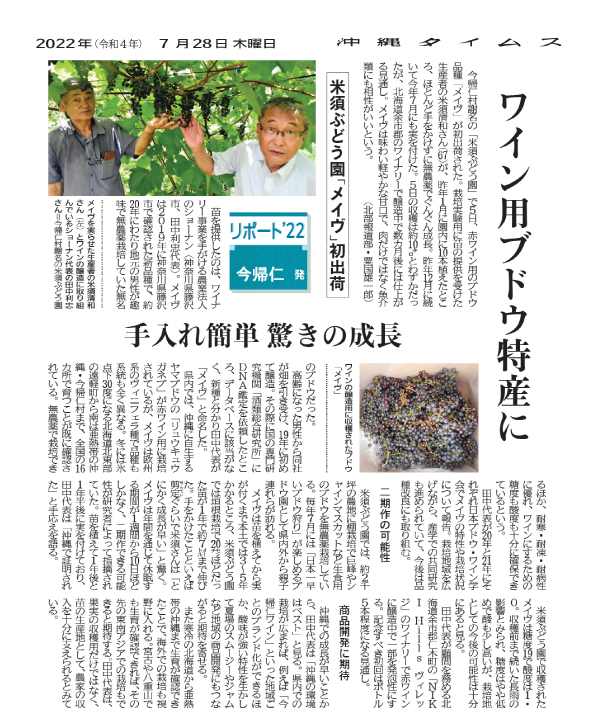 The Maeve grape variety for red wine was shipped for the first time on the 5th at Komesu Orchard in Jana, Nakajin Village, Okinawa Prefecture. Kiyokazu Komesu, 67, a grower who received seedlings for experimental cultivation, planted 10 seedlings in his orchard last January, and they have grown steadily without any pesticides and with very little care. The seedlings bore fruit in December of last year and again in July of this year. The harvest on July 5th was only about 10 kilograms, but the grapes are now being brewed at a winery in Yoichi County, Hokkaido, and the wine is expected to be ready in a few months. Maeve has a light, sweet taste and is said to go well with not only meat but also with seafood.