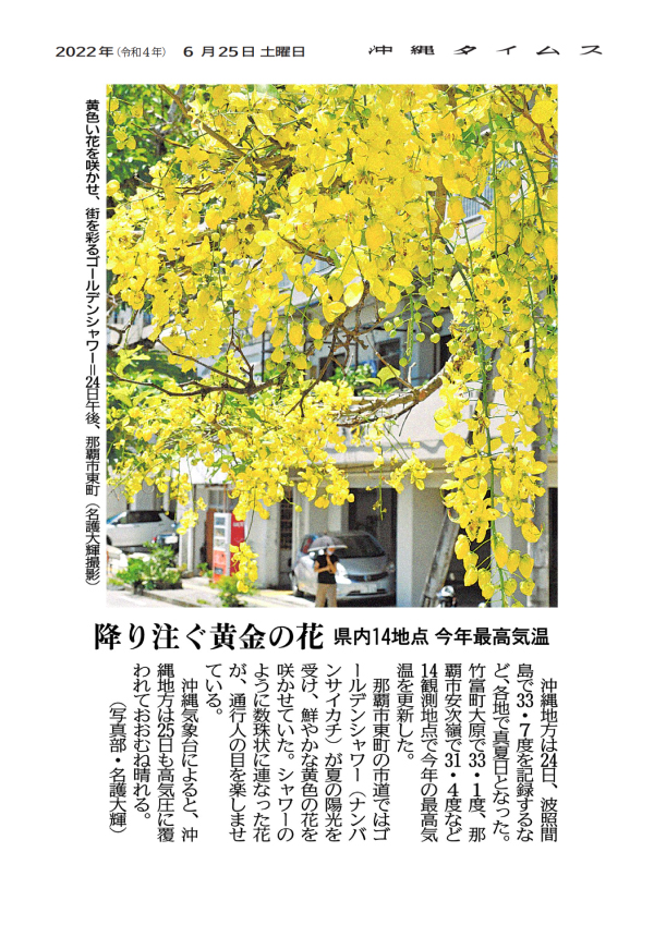 On a city road in Higashimachi, Naha City, bright yellow flowers in the summer sunlight were blooming on a golden shower tree (namban saikachi). The shower-like beads of flowers are a delight to the eyes of passersby. According to the Okinawa Meteorological Observatory, the Okinawa region will be covered by high pressure on the 25th, and the weather will be generally sunny. (Photo by Daiki Nago)