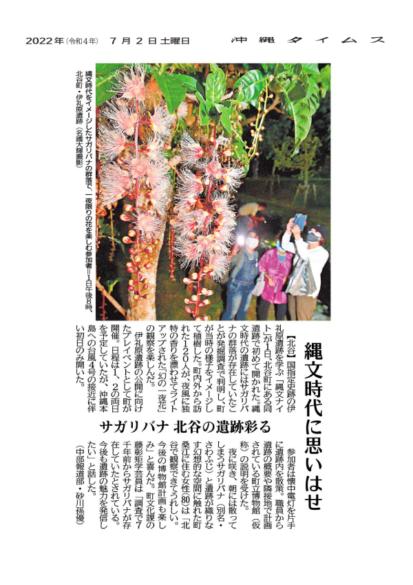 On January 1st, the first “Jomon Night” was held at the Ireibaru Ruins in Chatan Town, Okinawa Prefecture to help people learn about the Ireibaru Ruins, a nationally designated historic site. Excavations revealed the existence of a colony of Sagaribana at the Jomon-era ruins, and the town planted trees to evoke the atmosphere of that long-ago time. 120 visitors from the town and elsewhere enjoyed observing the “phantom overnight flower” illuminated with its unique fragrance in the night breeze.
