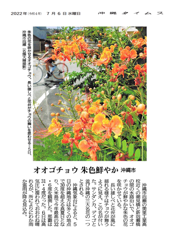 The vermilion flowers of the Ogocho, which means large butterflies, (Peacock flowers in English) are in full bloom. The long stamens and petals remind one of a fluttering butterfly. Taken in Awase, Okinawa City on July 5th. (Photo by Daiki Nago)