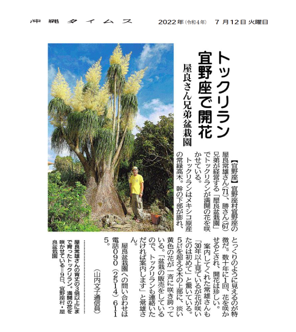 Tokkuriran, Ponytail palm, is in full bloom at the Yara Bonsai Garden, run by brothers Tsuneo Yara, 71, and Masaru Yara, 67, of Ginoza Village. The Tokkuriran is a tall evergreen tree native to Mexico. The lower part of the trunk swells up, making it look like a tokkuri, small sake bottles. It is said to bloom only once every few decades, so blooming is a rare occurrence. Tsuneo, who guided us around tree, was also surprised, saying, “I’ve been watching it for over thirty years, but this is the first time the flowers have bloomed.” Pale yellow flowers are blooming all at once at the top of the tree, which is over five meters tall. Tsuneo said, “We sell bonsai trees, so if you contact us, we will be happy to show you the Tokkuriran as well.”