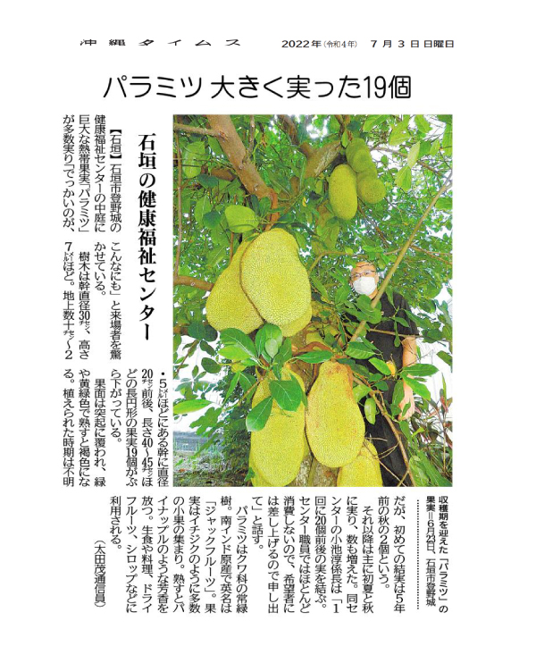 Many giant tropical “Jackfruit” fruits have grown in the courtyard of the Health and Welfare Center in Tonoshiro, Ishigaki City, and visitors are surprised to see them, exclaiming, “Wow, so many, and so huge!”.