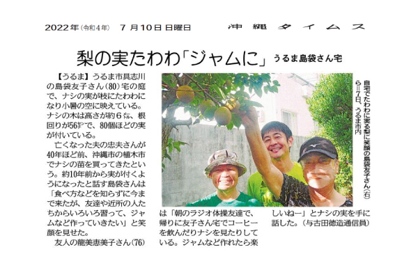 In the garden of Ms. Tomoko Shimabukuro, 80, in Gushikawa, Uruma City, pears are growing in profusion on the branches, beautiful against the slightly hot sky. The pear tree is about six meters tall, with a root circumference of 56 centimeters, and has about 80 pears on it. Her late husband, Tadao, bought the pear seedling at a plant fair in Okinawa City about forty years ago. According to her it has been bearing fruit for about ten years. “I didn’t know the best way to eat them until now,” she said with a smile, “but I would like to learn more from my friends and neighbors and make jam out of the pears.”