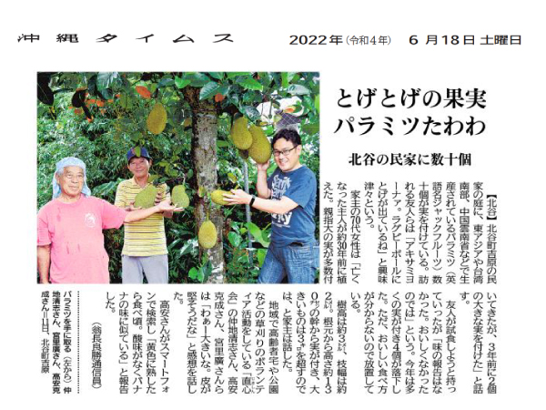 From the left, Mr. Kiyoshi Nakaji, holding a jackfruit, and Mr. Hiroshi Miyasato and Mr. Katsunari Takayasu, on June 11th, in Yoshihara, Chatan Town