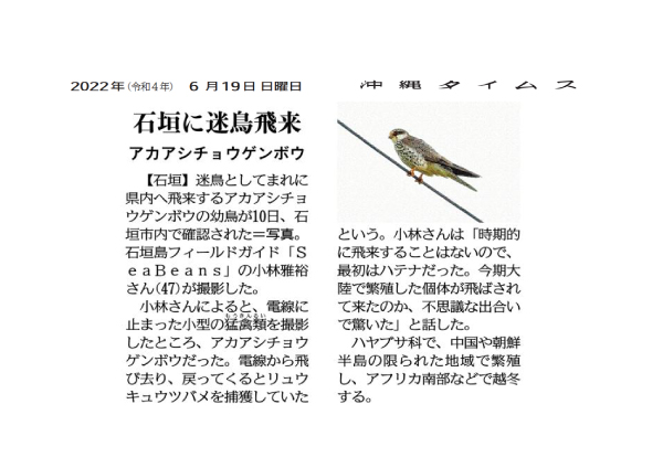 Photo: A young Amur falcon, which rarely strays into the prefecture, was confirmed in Ishigaki City on the 10th.
