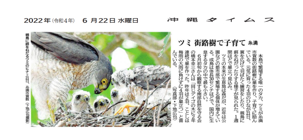 A sparrowhawk, the only hawk that breeds on the main island of Okinawa, has built a nest in a roadside tree in Kakazu, Itoman City, and is raising its young. On the 21st, four chicks were observed tentatively flapping their wings and begging their parents for food. It’s expected they will leave the nest in about a week. The original habitat of the Sparrowhawk is forests, but in recent years, an increasing number of them have been breeding in urban areas such as parks. Adult birds are about 30 cm in length, making them the smallest hawks living in Japan.