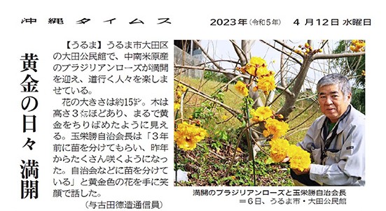 Blooming flowers in Uruma Enjoying the blooming flowers along the road Brazilian Rose trees, native to Central and South America, are in full bloom at the Ota Community Center in Ota-ku, Uruma City, delighting passers-by. The flowers are about 15 cm in size, and the tree itself is about 3 meters tall and looks like it is studded with gold. Mr. Masaru Tamae, the head of the community association remarked that, “I received the seedlings three years ago, and since last year so many flowers have been blooming. I have been sharing the seedlings with neighborhood associations.” He had a big smile as he held the golden flowers in his hands. (Reported by Tokuzo Yokota)