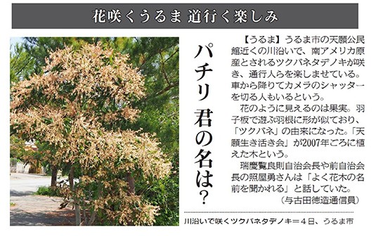 Along the river near Tengan Community Center in Uruma City, Tsukubane Tadenoki, Triplaris americana, which is said to be native to South America, is blooming now and delighting the eyes of passersby. Some people even get out of their cars and snap photos of the flowers. But what looks like a flower is actually a fruit. The shape of the fruit resembles the feathers on a battledore shuttlecock, which is the origin of their name, “tsukubane,” (a feathery, colorful shuttlecock). The tree was planted around 2007 by the Tengan Ikiiki Kai. Yoshinori Zukeran, the neighborhood association president, and Isamu Teruya, the former president said, “We are often asked the name of this flowering tree.” (Reported by Tokuzo Yokota)