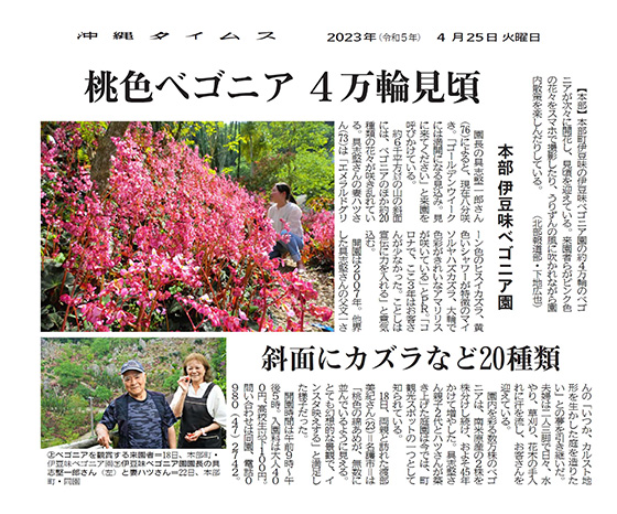 A mountain slope of about 6,000 square meters is covered with begonias and about twenty other types of flowers, also in full bloom. Mr. Gushiken’s wife, Hatsu, 73, actively promotes the flowers, saying, “There are emerald green color Jade vine, yellow and brick color Thunbergia Mysorensis, and large, colorful amaryllis are now blooming.” She explained that “Due to the Corona pandemic we have had very few visitors for the last three years. We will more focus on advertising the garden this year.”