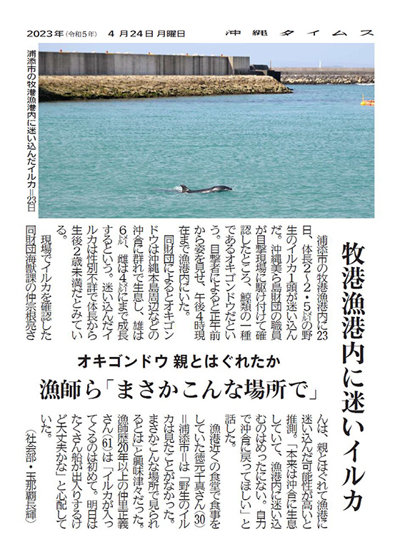 On the 23rd, a wild dolphin between 2 and 2.5 meters in length wandered into Makiminato fishing port in Urasoe City. A staff member of the Okinawa Churashima Foundation rushed to the spot where it was sighted to confirm that it was an Okigondo, a false killer whale, a type of cetacean.