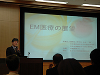 Dr. Sugimoto explained that in order for disease not to occur, the essential response has to be focused on creating a situation in which effective microorganisms (good microbes) can predominate in the minutest environment that surrounds living beings, namely the microflora. Dr. Sugimoto firmly emphasized that we must EMTM-ize, so to speak, not only our surroundings but the environment within the human body itself, and he made very clear the aims of EMTM medicine.