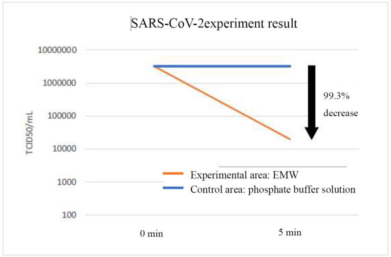 In the experiment, 1ml of undiluted EMW was added to SARS-CoV-2 (Novel Coronavirus), while 1ml of sterilized phosphate buffer solution was added in the control area. Virus infectivity was measured in cultured cells at the beginning of the experiment and 5 minutes later to investigate the inactivating effect on the virus.