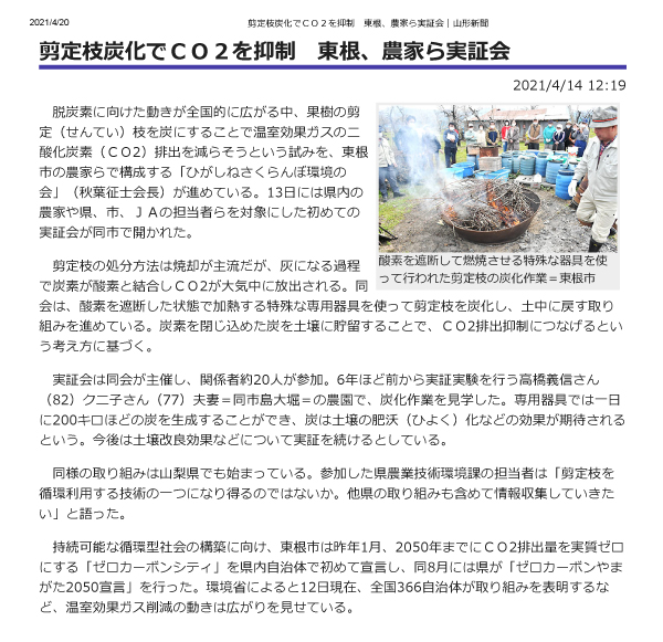 As the movement toward lowering carbon levels spreads nationwide, the Higashine Cherry Environmental Association (Chairman: Seiji Akiba), consisting of farmers in Higashine City, is taking steps to reduce the emission of carbon dioxide (CO2) from greenhouse gases by turning the pruned branches from fruit trees into charcoal. On the 13th, the first demonstration was held in Higashine City for farmers in Yamagata Prefecture and officials from the prefecture, nearby cities, and JA (Japan Agricultural Cooperatives).