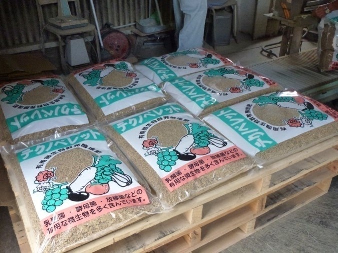 When the fermentation is completed, the compost is pelletized and dried by machine. After packaging, the "Techno Pellets" are ready. Techno-pellets promote plant growth because they contain many effective microorganisms that react effectively with organic matter in the soil. 150 tons of Techno Pellets are produced annually and are used to grow flowers, muscatel, etc. in the city of Funao. Two thirds are sold outside the town and used for home gardening and agriculture.