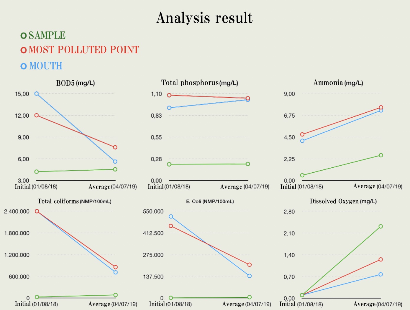 At the beginning of the project, the first sample showed that the 1st sampling point (Green) had the best water quality, the 2nd point (Red) showed the most pollution and the 3rd (Blue) was the closest to the mouth, closest to the sea.
