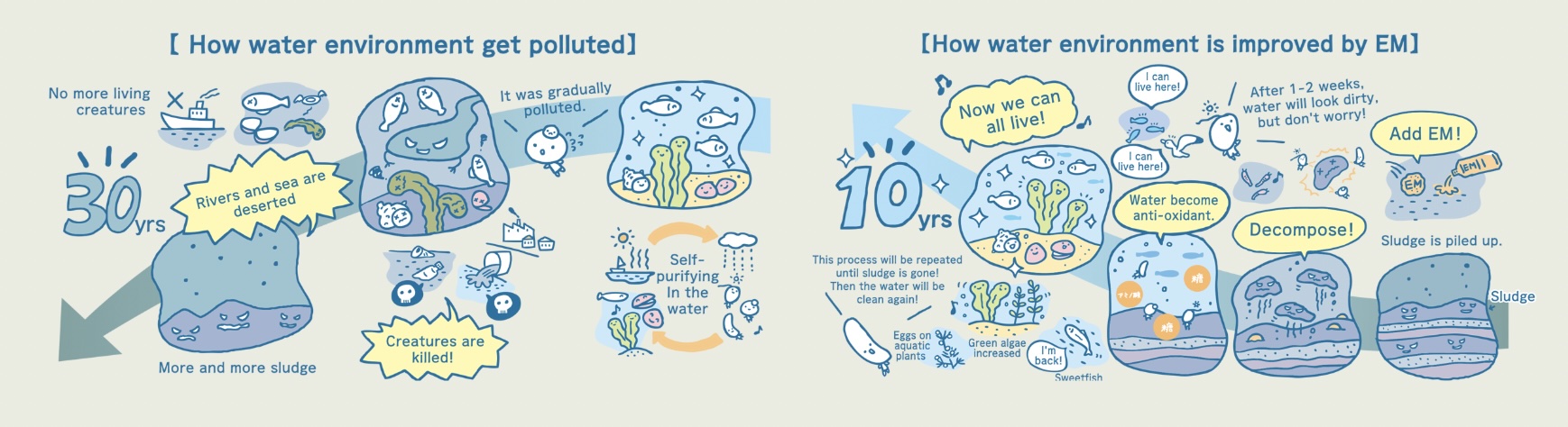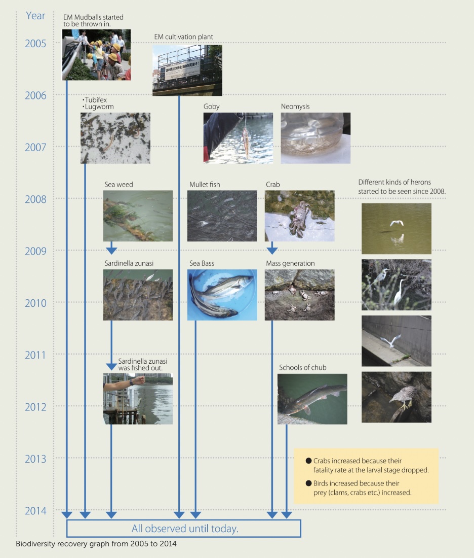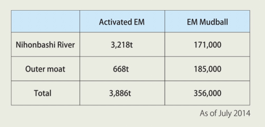 Hoping that, when the blue sky returned to Nihonbashi, the Nihonbashi River would be once again be a clear-running-river, people began their efforts to improve the water system under the slogan “Revive the Nihonbashi River!” By then, the use of EM had been successful in cleaning the Asechi River, and organizations such as the Historic Bridge “Nihohnbashi” Preservation Society and the not for profit organization Bring Back Clean Water in Nihonbashi River・Kanda River, have implemented this activity utilizing EM along the Nihonbashi River with the cooperation of companies and civil organizations.