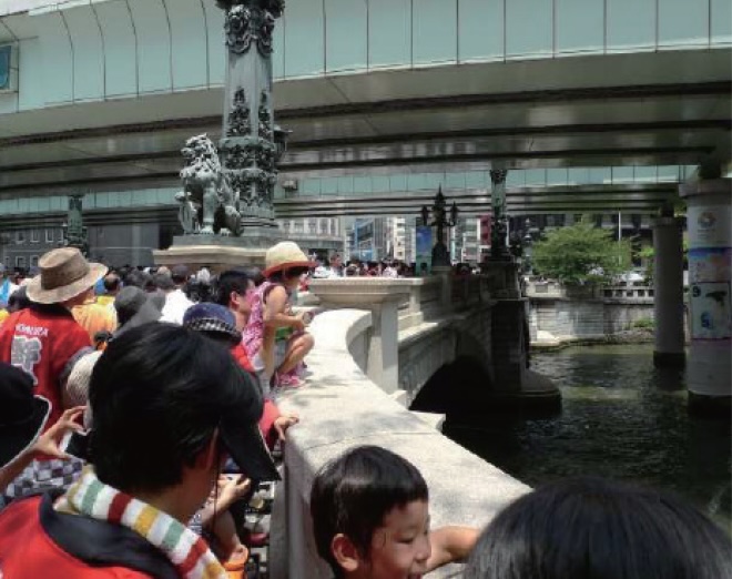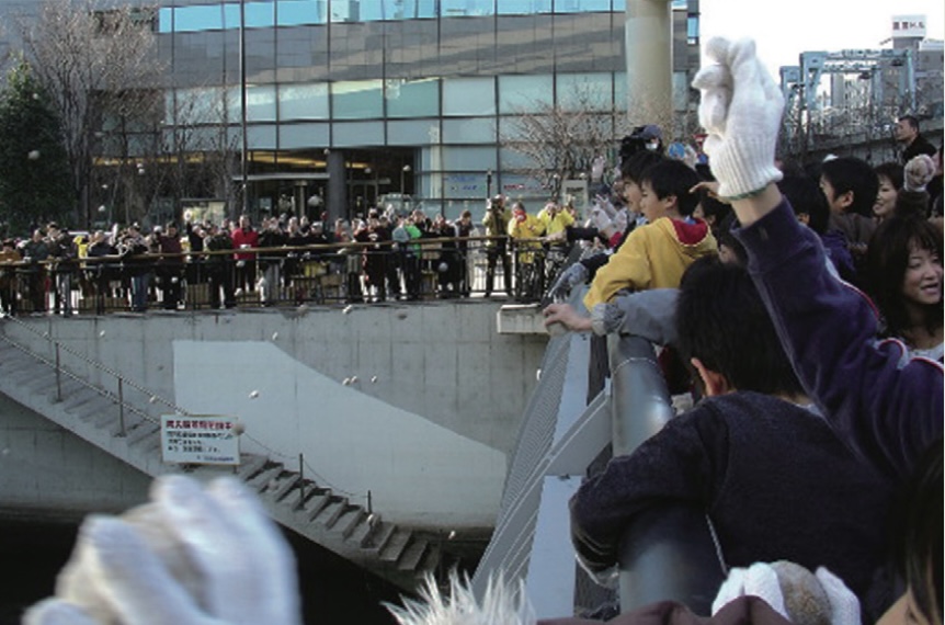 Volunteers throwing EM Mudballs to the Nihonbashi River