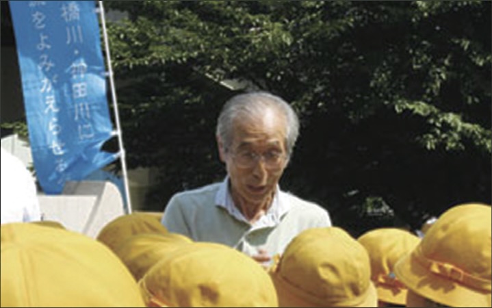 Mr. Isamu Hayashi (Chairman of the Revive Clean Water in Nihonbashi River and Kanda River Group) speaking to local elementary school children who participated in EM Bokashi fermented Mudball project