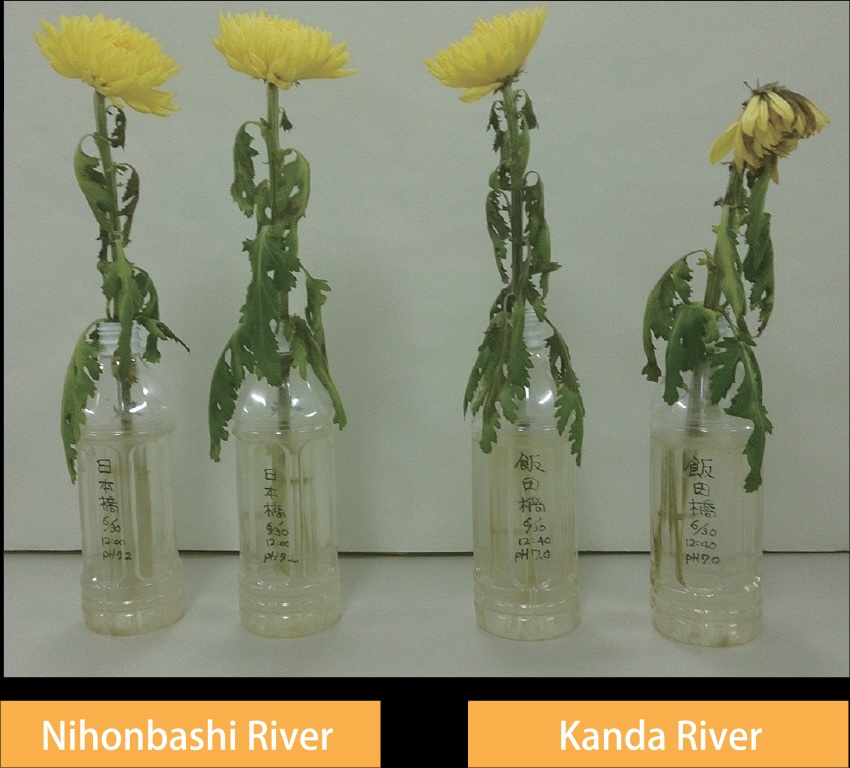 Professor Higa himself tried the method of determining the water quality. Using the water of the river right beneath Nihonbashi bridge and the water of the Kanda River near the Kanda Employment Security Office where there seems to be little influence of EM application, he put a stem of chrysanthemum in each bottle. Ten days later, there is a distinct difference between them. In the bottom sediment survey, in the vicinity of Nihonbashi it smells less, while the water in Kanda River from the front of Kanda Employment Security Office has a strong odor.