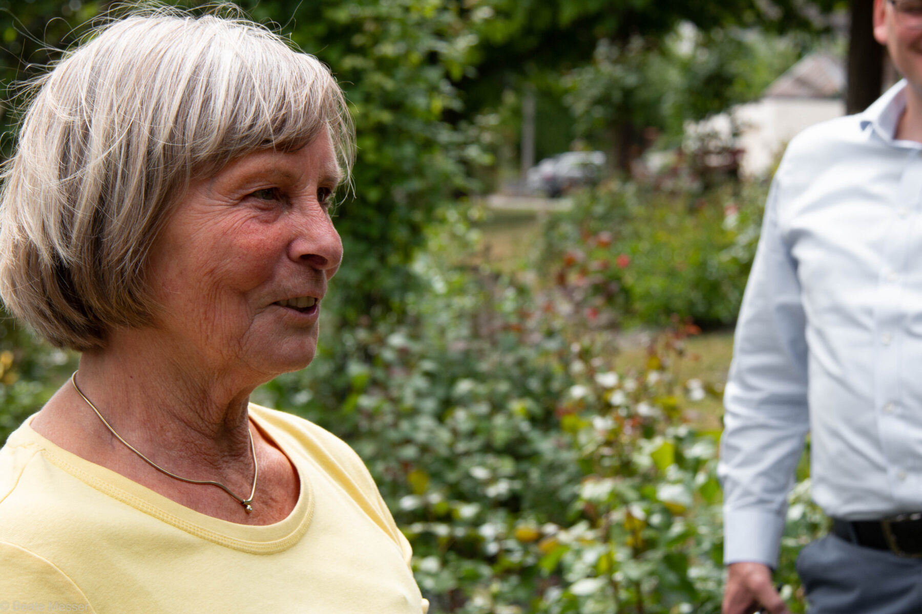 Karin Zwermann explains the EM application in the garden pond to visitors on the open garden day