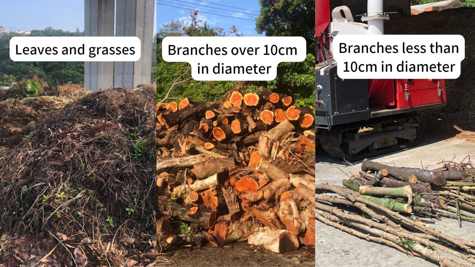 Branches less than 10cm in diameter are crushed by a wood chipper