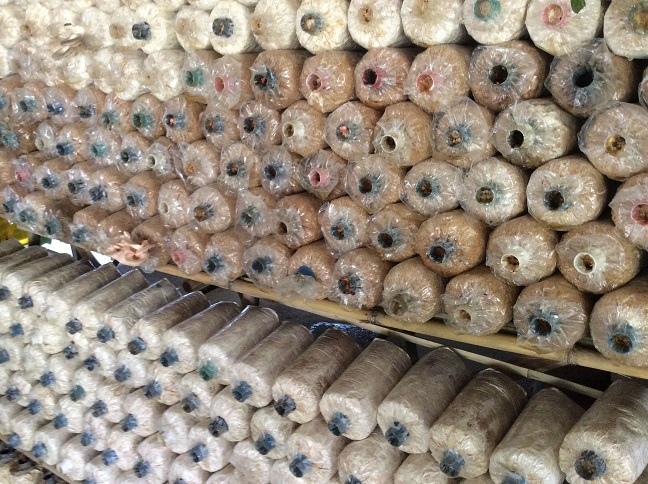 They mix sawdust, rice bran, lime, gypsum, rock phosphate, water, EM・1 and molasses to make the substrate. The fermented mixture is put into plastic bags in anaerobic condition and the cultivation of the mycelia is carefully deposit in each bag. Mushrooms are growing healthy and are sprayed with Activated EM for sanitary control.