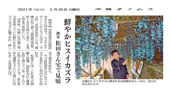 Ten years ago, Mr. Matsuda was fascinated by the brilliant color jade vine blooming at a private home in Nakijin Village, and started cultivating it from cuttings. Now, people from the village and elsewhere come to see Mr. Matsuda’s jade vines. “I grow them with love,” he said with a smile, “using my experience, a fatherly style, and my skill. Having so many people see them gives me the motivation to do my best again next year.”
