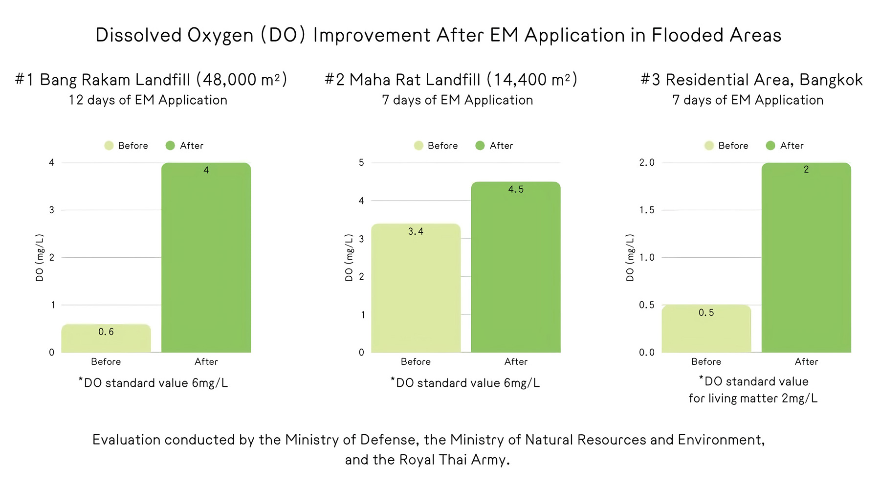 To evaluate the impact of EM on floodwaters, the government monitored water quality by measuring dissolved oxygen (DO) levels before and after treatment, resulting in clearly positive improvements.